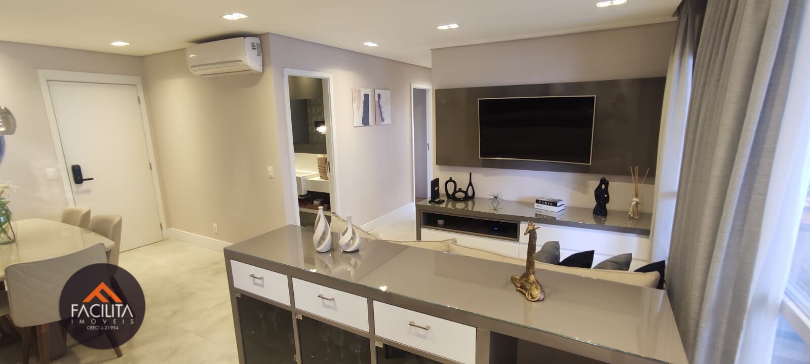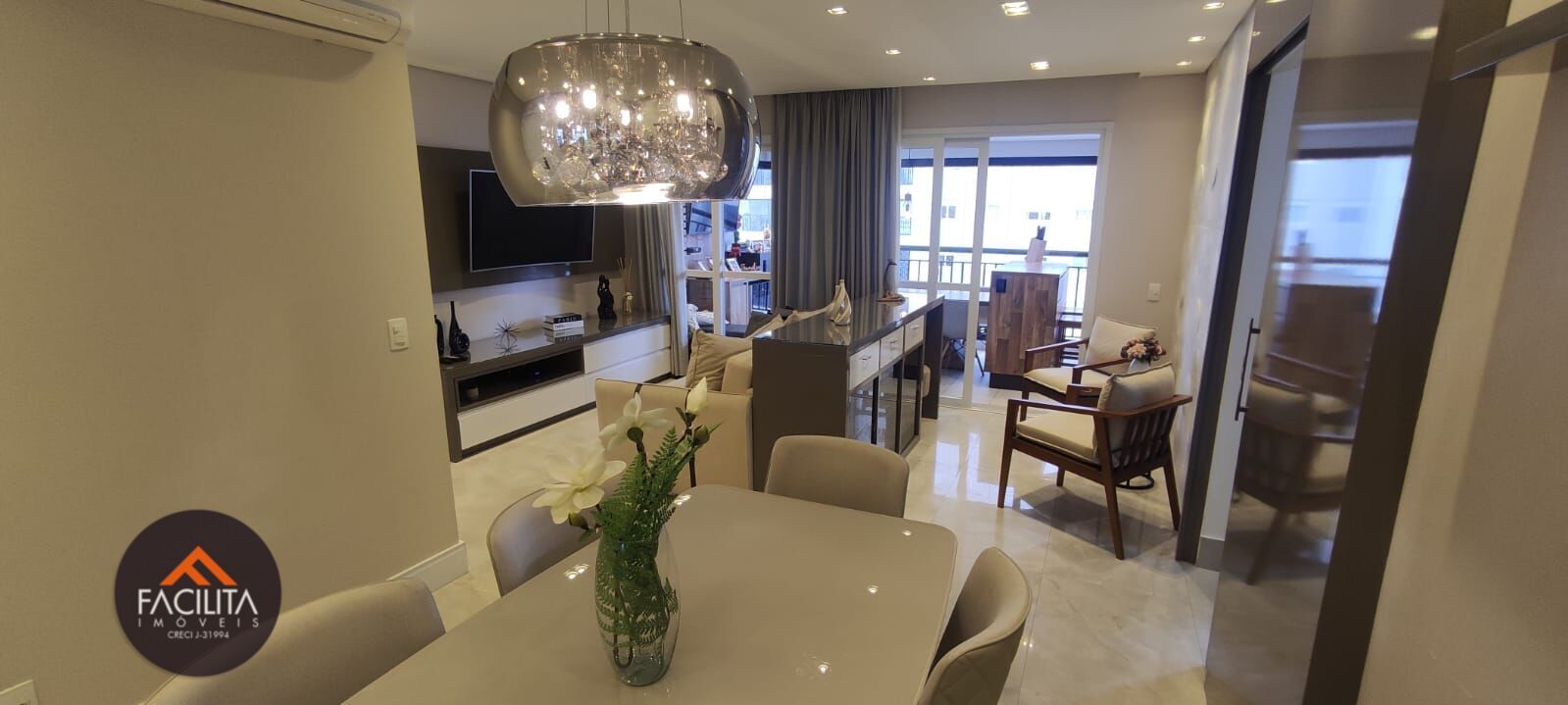 O imóvel apresenta três dormitórios, sendo todos eles suítes, e todos com ar condicionado (suíte principal com closet), 3 banheiros mais um lavabo, ar condicionado na sala, além de 2 vagas de garagem com depósito 2x2m
